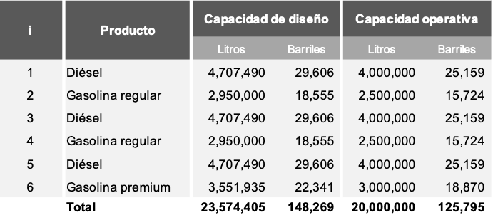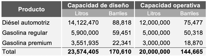 El proyecto contempla una capacidad operativa de almacenamiento de 20,000,000 litros (125,796 barriles) de petrolíferos (gasolina regular, gasolina premium y diésel automotriz),